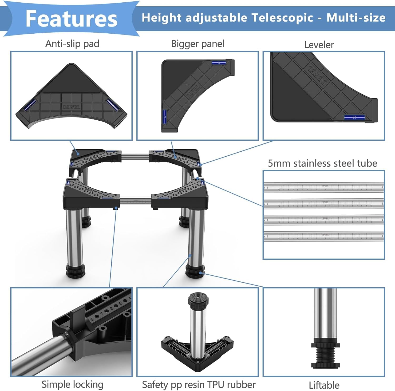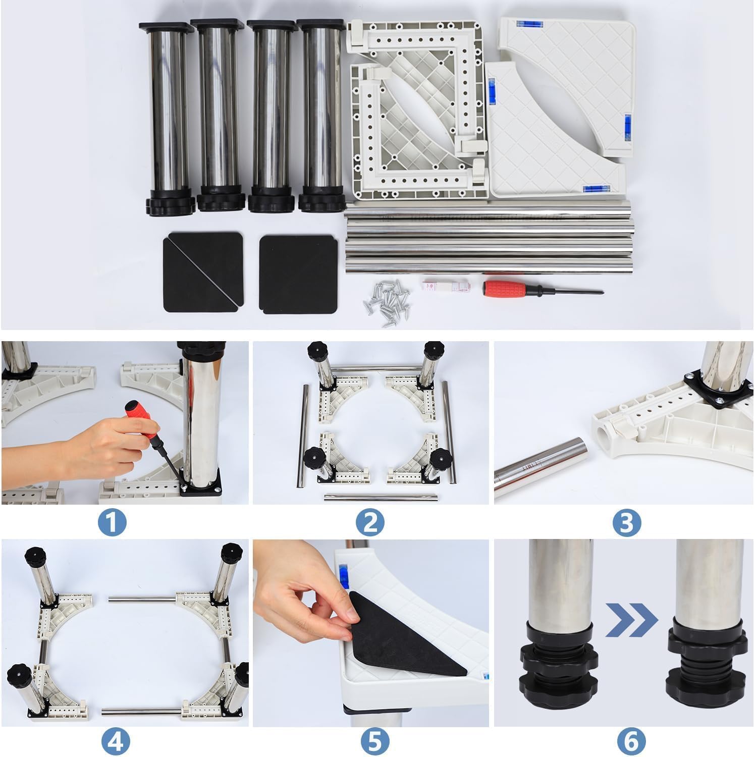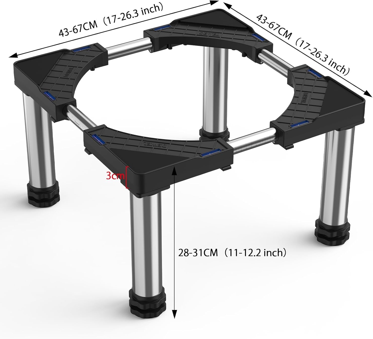 - Adjustable Size: The height is 28-31 cm / 11-12.2 inches, the length / width is 43-67 cm / 17-26 inches. The dishwasher base can be adjusted vertically and horizontally according to the width of the appliance. Our steel pipes are raised, reinforced, durable, corrosion-resistant and thickened