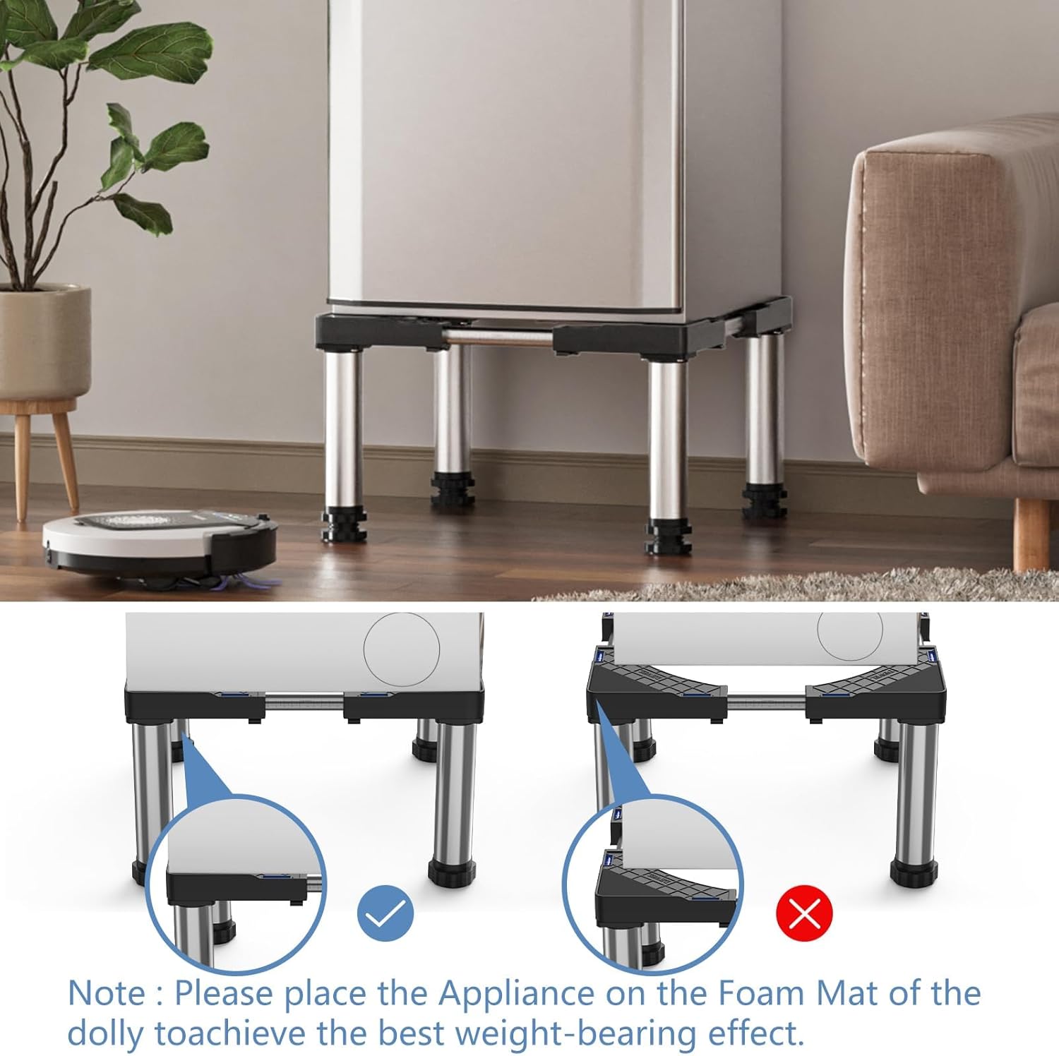 - Warm Tips: This base is recommended for dishwashers, freezers, kitchen cabinets and pantries. Not suitable for non-static appliances such as washing machines and dryers: the higher center of gravity of the appliance shakes when the appliance is in use. Maximum load: 300 kg