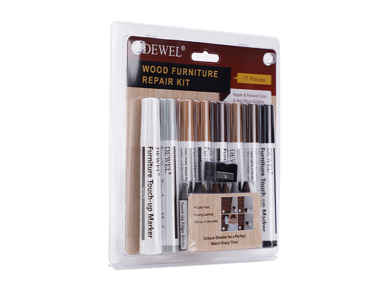 Product Details: 17 piece furniture repair kit, 8 touch up markers and 8 wax sticks with 1 sharpener.